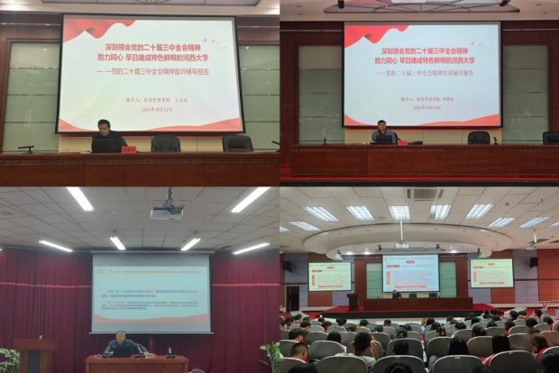 为深入学习宣传贯彻党的二十届三中全会精神,坚持不懈用党的创新理论铸魂育人,10月10日至14日,经济管理学院党委负责人、组织员分别为学院500余名学生作题为《深刻领会党的二十届三中全会精神,勠力同心 早日建成特色鲜明的河西大学》的专题辅导报告。