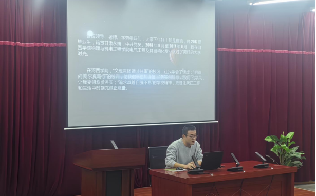 11月24日下午,物理与机电工程学院邀请2017届电气工程及其自动化专业毕业生、国网哈密供电公司供电服务指挥中心康凯作了题为“努力不负青春,汗水见证成长”的报告。学院负责人、班主任、辅导员及200余名师生参加。