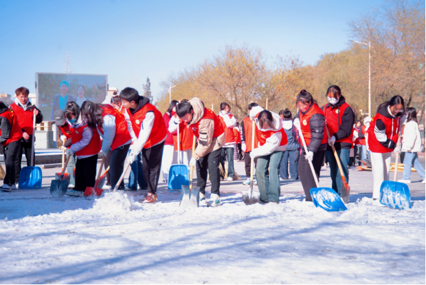 志愿者们身着红色马甲,手持铁锹、镐头、扫帚等工具,在河西讲堂、塑胶操场环形路口、家属区小广场、白塔寺、音乐楼前、北区超市、南区敦煌艺术广场等区域开展扫冰除雪工作。除雪现场,志愿者们分工明确,有的负责铲除积雪,有的负责清扫路面上的碎冰,还有的负责将清理出的积雪和冰块运送到指定地点。尽管天气寒冷,但志愿者们的热情却丝毫未减,他们相互协作,共同奋战,为校园的安全和整洁贡献着自己的力量。一个个忙碌的身影成为了校园中最光鲜靓丽的风景线,为这寒冷的冬天带来了一丝温暖。