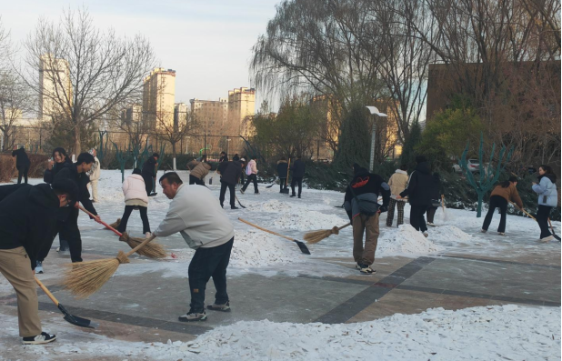 活动当日,尽管天气寒冷,大家分工明确,配合默契,教工党员们率先垂范,他们拿起铁锹,用力地铲起厚厚的积雪,一锹一锹地将积雪堆放到路边,学生党员们也挥动着扫帚,认真清扫着路面上残留的雪末,不放过任何一个角落,干劲十足。经过全体师生党员的齐心协力,广场道路的积雪被清理得干干净净,方便了师生们的出行。
