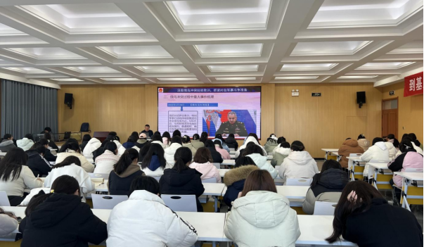 沈承福以“牢筑国防意识,厚植爱国情怀”为主题,结合自身专业和多年的军事研究,通过“俄乌冲突”等前热点事件,深入剖析了地缘政治冲突、军事战略博弈等,解读了国际安全形势的复杂性与严峻性,深刻阐释了国防建设在国家振兴进程中的重大意义,引导同学们要牢固树立国防意识,厚植爱国情怀,把个人理想融入中华民族伟大复兴。他鼓励同学们要珍惜时光、刻苦学习,强健体魄、拓展素质,努力成才、报效祖国。在活动环节,就同学们关心的报考军队文职和大学生应征入伍等热点话题进行了解答,热切鼓励有志护理学子,白衣红心立志从军,携笔从戎报效祖国,努力在绿色军营中锤炼意志、施展才华。