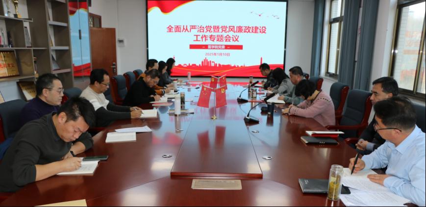 1月10日,医学院在行政楼三楼会议室召开全面从严治党暨党风廉政建设工作专题会议,学院负责人、党委委员、科级干部、各党支部书记参加。